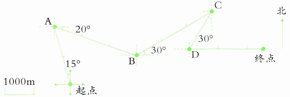 起点到A:方向北偏东$15^{\circ}$,路程$2×1000 = 2000m$;