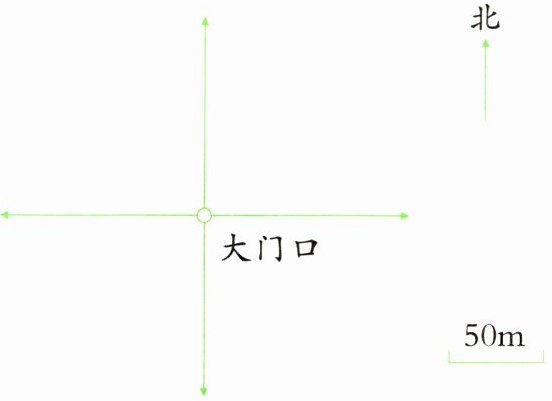 1. 以大门口为原点,比例尺为图上1厘米代表实际50米。