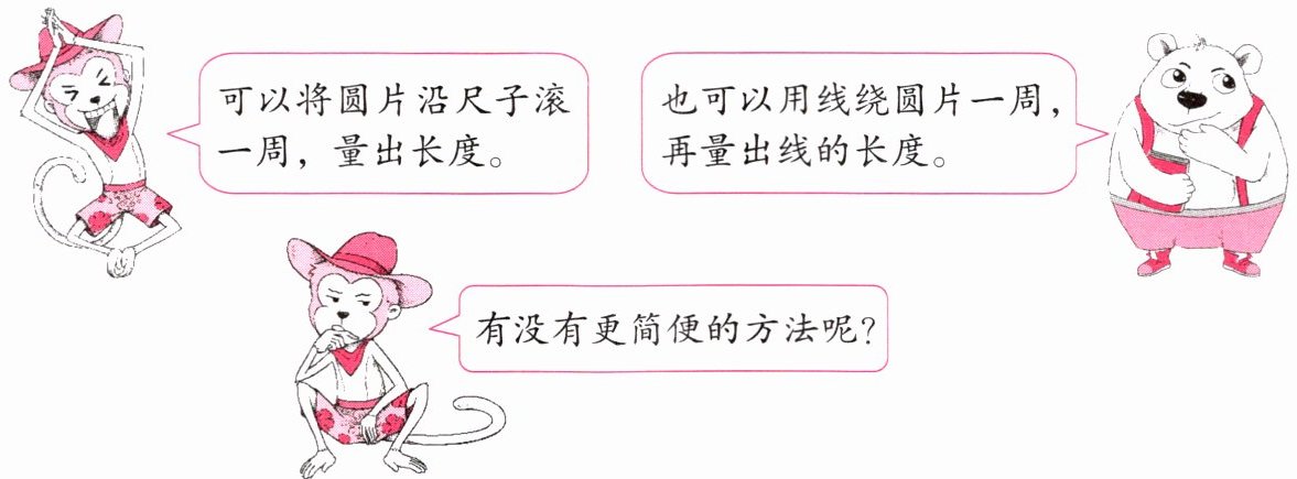 1. 用硬纸片画一个圆,再剪下来。你有办法测量出这个圆的周长吗?