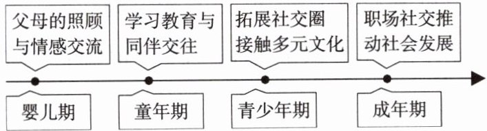 (1)我们的成长是不断社会化的过程。父母的抚育、老师的教诲、同伴的帮助和社会的关爱等,为我们的成长提供了必要的支持。在社会生活中,我们学习知识,提升能力,锤炼品格,逐步成长为一名合格的社会成员。