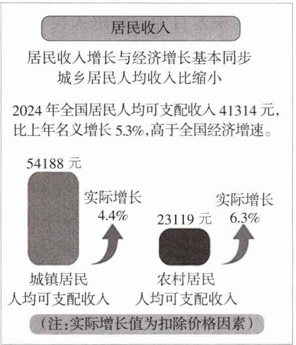 (1)图表反映了2024年全国居民人均可支配收入、城乡居民人均可支配收入均稳步增长,农村增长速度高于城镇。居民收入与经济增长基本同步,城乡居民人均收入比缩小。但城乡居民人均可支配收入还存在较大差距。这说明我国经济高质量发展,人民生活水平提高。但我国还存在城乡发展不平衡、不协调的现实挑战。