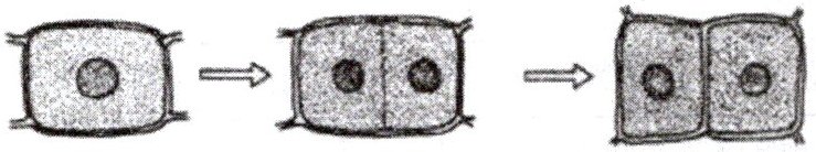 下一个阶段画两个较小的圆形,分别有一个细胞核,表示细胞膜向内凹陷,细胞缢裂成两个。