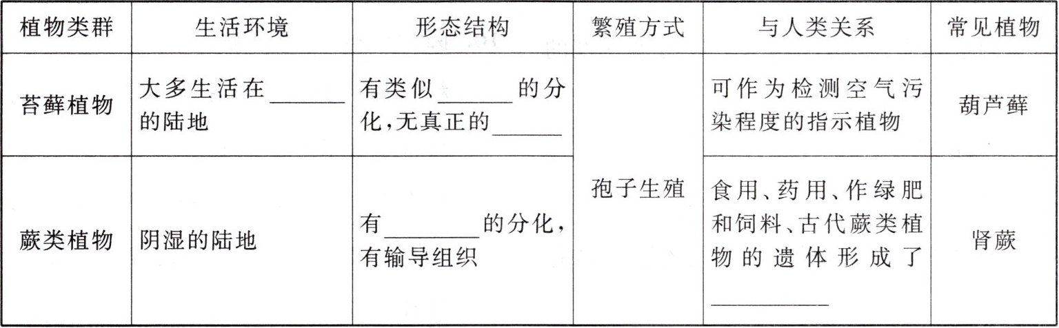 |植物类群|生活环境|形态结构|繁殖方式|与人类关系|常见植物|