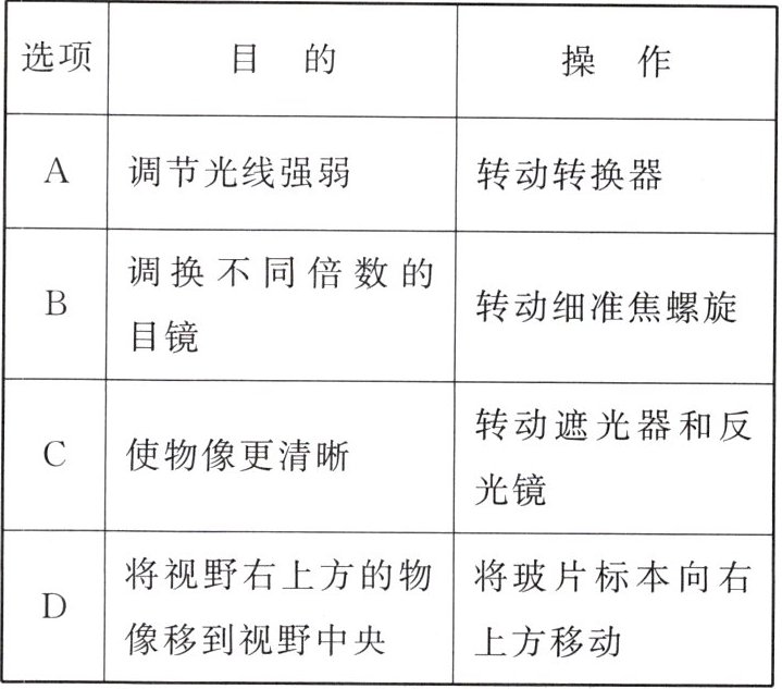 |D|将视野右上方的物像移到视野中央|将玻片标本向右上方移动|