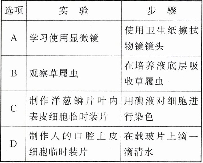 |D|制作人的口腔上皮细胞临时装片|在载玻片上滴一滴清水|