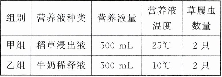 |甲组|稻草浸出液|500 mL|25℃|2 只|
