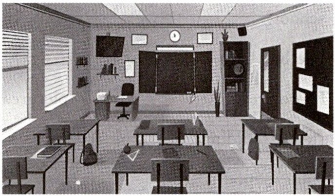 it. On the front wall of the classroom, there is a smart blackboard. There (2)is