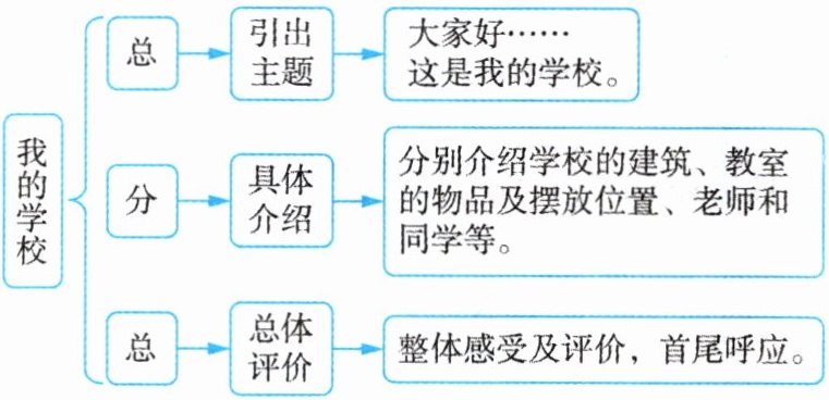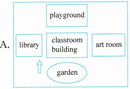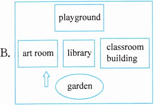 Walk into the school, you can see a big garden in front of you. There are green trees and red flowers in it. Behind the garden, that's our classroom building. It's between the library and the art room. There is a big playground behind the classroom building, too. After school, some students go to the library to read books. Some go to the playground to play football. I like going to the art room with my friends.