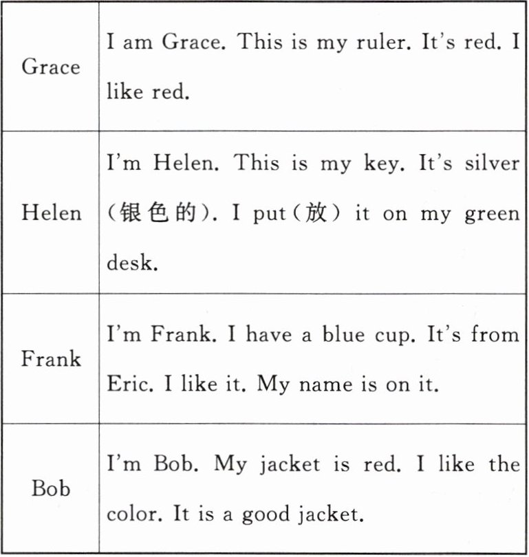 This is my classroom,it's big. In the classroom,you can see a table,six desks and six chairs. You can see a boy and two girls,too. Some books are on the table. A pencil box is on the desk. Two pencils and an eraser are in the pencil box. And the bag is under the chair. The boy is Jim. He is twelve. The girl in a hat is Lily. She is twelve,too. Here is a girl,too. She is Sue. She is eleven. Their teacher is Mr Green. He is not in the classroom.