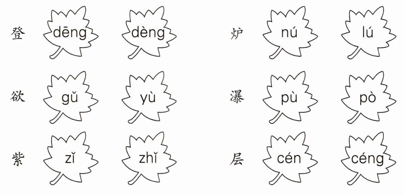 读一读,给字选择正确的读音,并给叶子涂上喜欢的颜色。