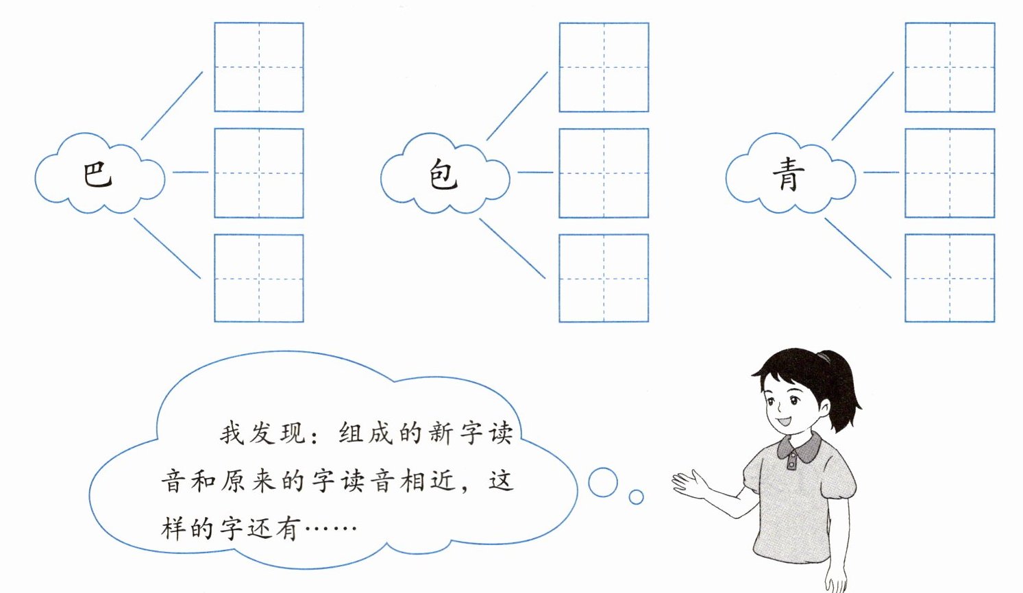 发现:这些字都是形声字,原来的字(巴、包、青)作为声旁,新组成的字读音和原来字的读音相近。例如“巴”(bā),“把”(bǎ)、“爸”(bà)、“吧”(ba)读音相近;“包”(bāo),“抱”(bào)、“跑”(pǎo,声母 p 和 b 发音部位相近)、“泡”(pào,声母 p 和 b 发音部位相近)读音有一定联系;“青”(qīng),“清”(qīng)、“晴”(qíng)、“情”(qíng)读音相近。这样的字还有“方”(fāng),可组成“放”(fàng)、“房”(fáng)、“防”(fáng)等。