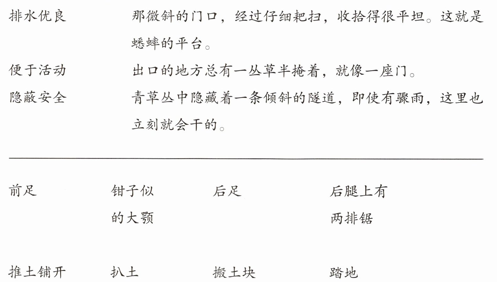 的词语,通过这些词语,可以体会到蟋蟀修建住宅的时间长,法布尔对蟋蟀住宅进行了长时间的细致观察