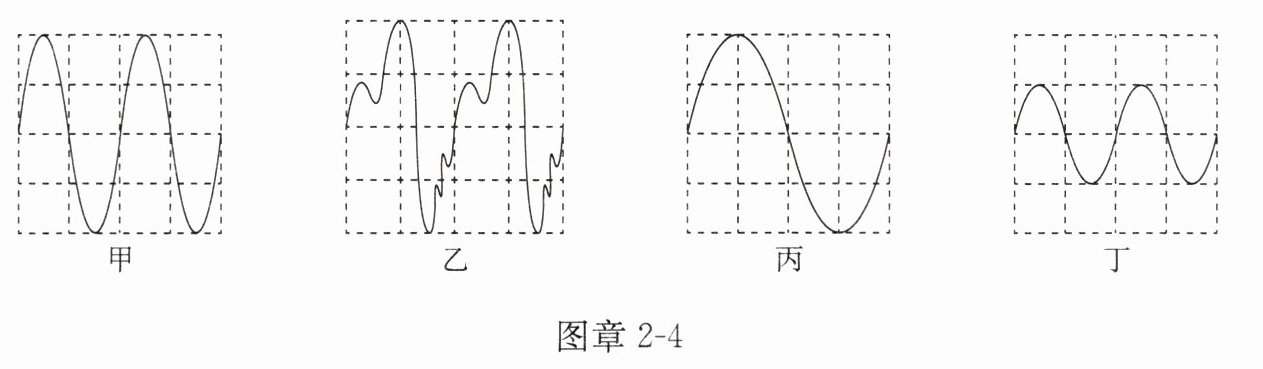 15. 某手机中的分贝测试软件如图章2-3所示,它可用来呈现声音的______。如图章2-4所示是几种声音输入示波器中显示的波形,据图可知,甲、乙两种声音的______不同,甲、丁两种声音的______不同。(均选填“响度”“音调”或“音色”)