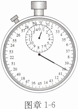 15. 为测自己的跑步速度,小明在一段长为 200 m 的平直道路起点开始计时,跑到终点停止计时,秒表示数如图章 1 - 6 所示。小明跑完此段路程用时______s,平均速度为______m/s。