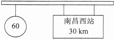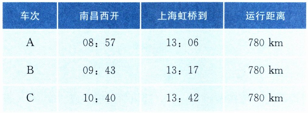 【解】(1)由题图知,出发地距离南昌西站的路程$s=30\ km$,限速$v=60\ km/h$,由$v=\frac{s}{t}$可知,驾车到南昌西站所用的最少时间$t=\frac{s}{v}=\frac{30\ km}{60\ km/h}=0.5\ h=30\ min$王爷爷8:35开车出发,经过30min后,到达南昌西站的时间为9:05,由于到站时火车车次A已经出发,根据实际情况,他们最快能赶上车次B。(2)根据列车时刻表可得,乘坐车次B到达上海虹桥站所用时间$t'=13:17-9:43=3\ h\ 34\ min=3.57\ h$,又因为总路程$s'=780\ km$,所以高铁列车运行的平均速度$v'=\frac{s'}{t'}=\frac{780\ km}{3.57\ h}=218.5\ km/h$因此,这趟高铁列车运行的平均速度为218.5km/h。