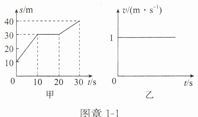 4. 甲、乙两人在同一平直公路上同时、同向出发,前往同一目的地。甲从距离原点 10 m 的位置出发,在 30 s 时到达目的地,其 $ s - t $ 图像如图章 1 - 1 甲所示。乙从原点出发,其 $ v - t $ 图像如图章 1 - 1 乙所示。下列分析正确的是( )