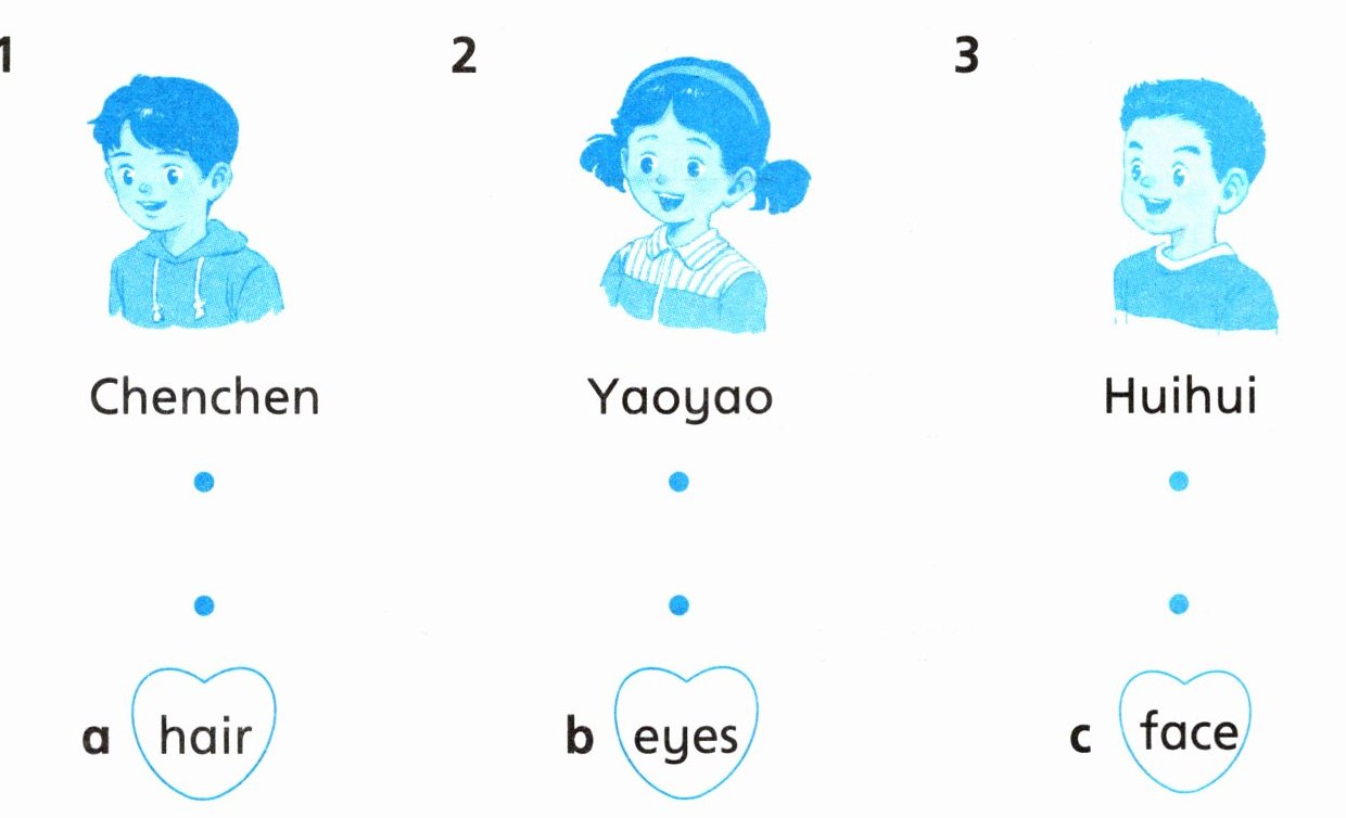 A Listen and match (听录音,将人物与他们喜欢的身体部位连起来)