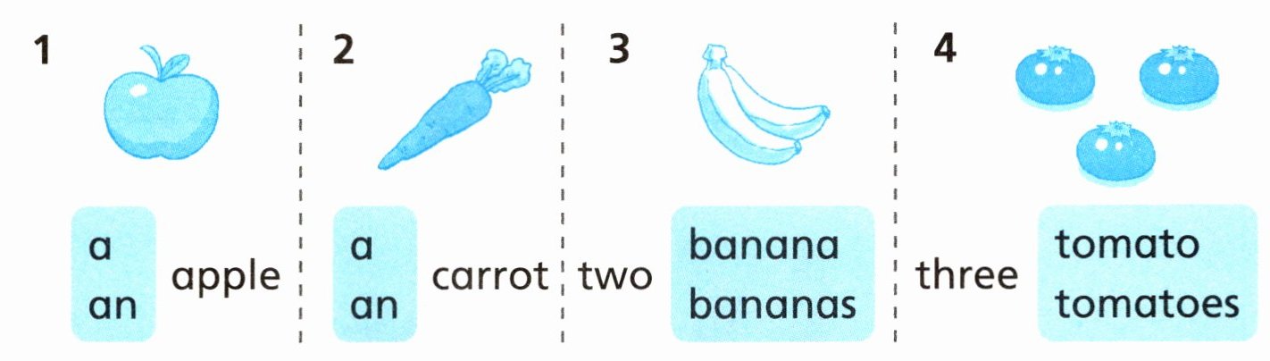 1. an 2. a 3. bananas 4. tomatoes