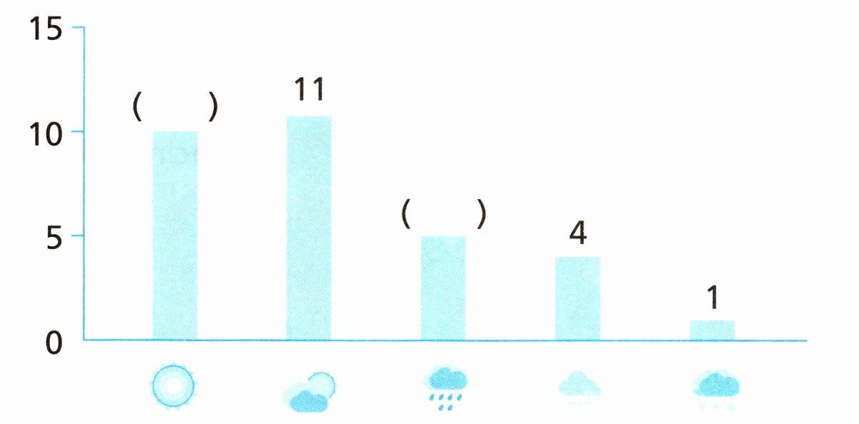 Bar graph: 10, 5 Table: sunny, 10; cloudy; rainy, 5; windy