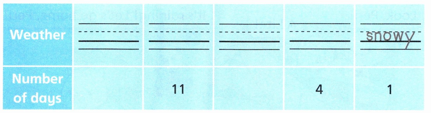 B Look, trace and write(下面是一座城市在一个月内不同天气的天数统计表,描一描,写一写,完成表格)