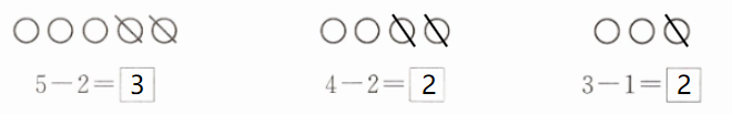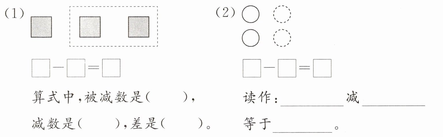 图中一共有$3$个正方形,虚线框里有$2$个正方形,表示去掉$2$个正方形,所以可列减法算式$3 - 2 = 1$。