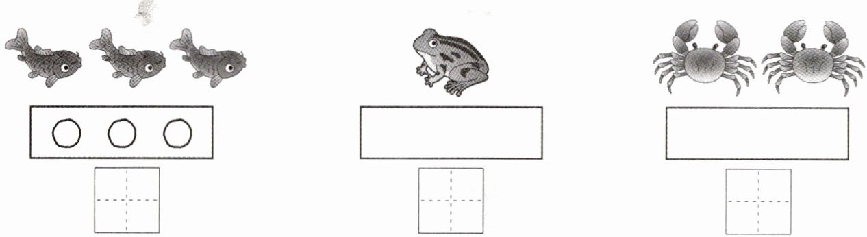 数一数青蛙的数量为1,在下方长方形内画1个竖道表示1,在下面田字格中写“1”。
