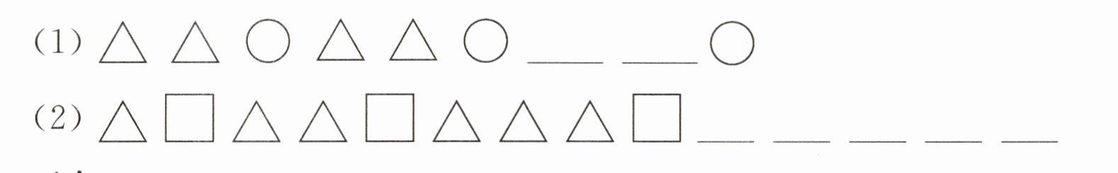 在$\triangle\triangle\triangle□$之后,$\triangle$的数量应该是$4$个,然后是$1$个$□$,所以空缺处应依次画$\boldsymbol{\triangle}$、$\boldsymbol{\triangle}$、$\boldsymbol{\triangle}$、$\boldsymbol{\triangle}$、$\boldsymbol{□}$。