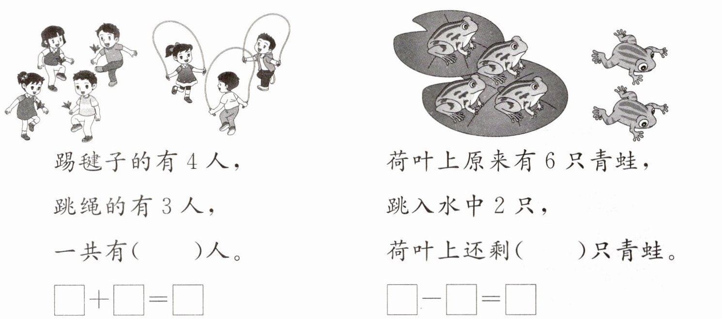 本题可根据加法和减法的意义分别计算人数和青蛙的数量。