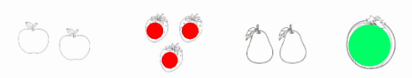 5. 数一数每种水果各有多少个,把个数最多的涂红色,最少的涂绿色。