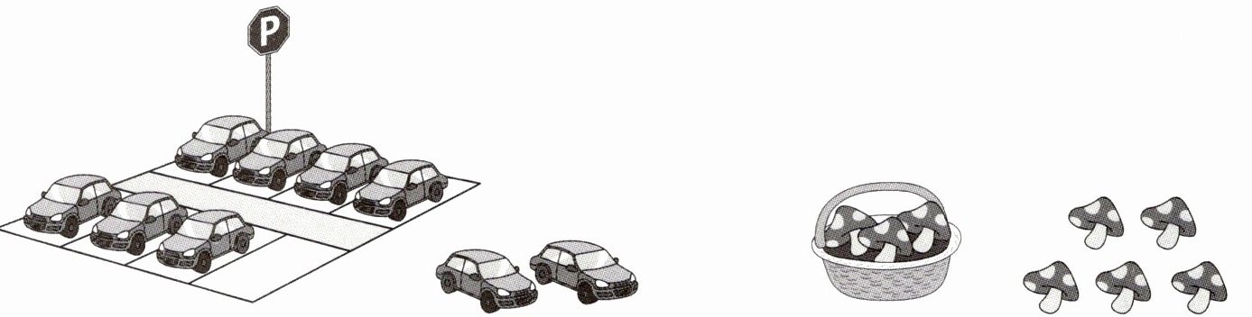 篮子里有3个蘑菇,篮子外有$5$个蘑菇,一共有8个蘑菇,$3 + 5 = 8$。