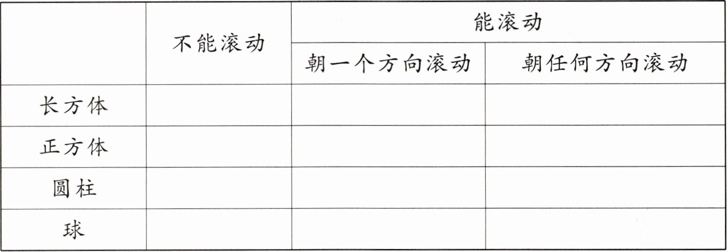 | 正方体 | | √(特殊情况,当底面是正方形时可朝四个方向滚动,但一般教材认为其滚动性不如球和圆柱,这里按能滚动处理) | |