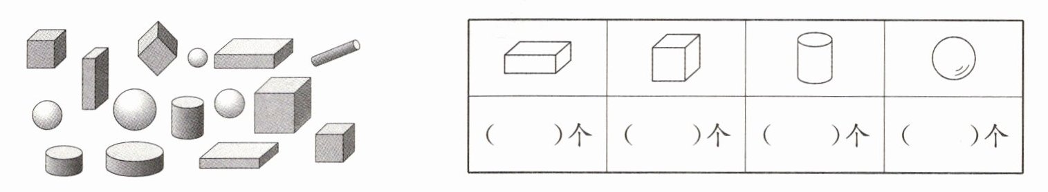 (1)正方体有( )个,圆柱有( )个,长方体有( )个,球有( )个。