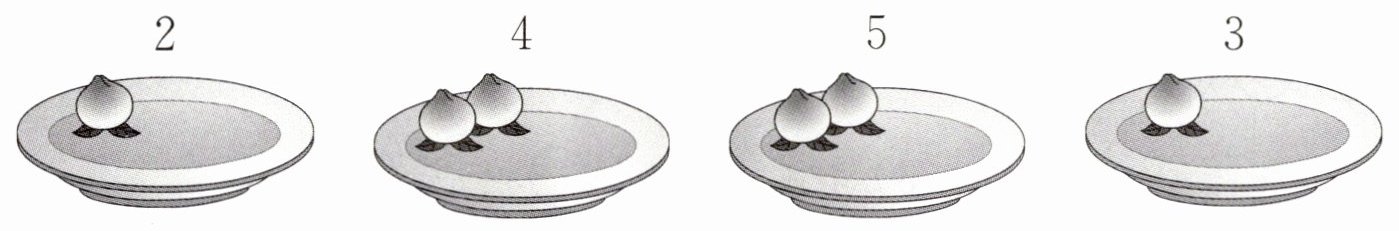 (在第一个盘子里画1个桃,第二个盘子里画2个桃,第三个盘子里画3个桃,第四个盘子里画2个桃)