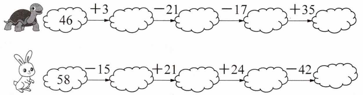 所以,从左到右,乌龟路线中依次填:49;28;11;46。兔子路线中依次填:43;64;88;46。