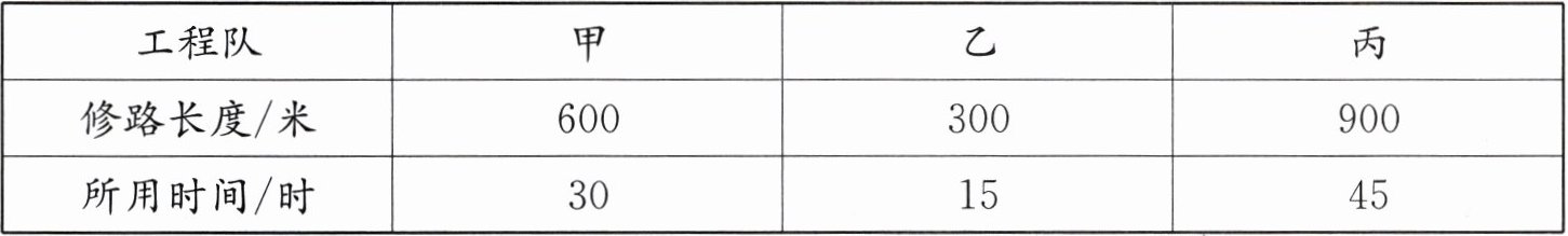 甲、乙、丙三个工程队修路长度和所用时间如下表。
