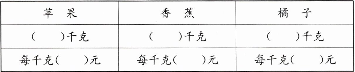 1. 小华买了 3 千克苹果、5 千克香蕉、4 千克橘子。已知苹果每千克 10 元,香蕉每千克 8 元,橘子每千克 6 元。(先列表整理条件,再解答)