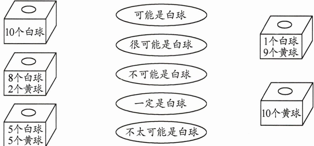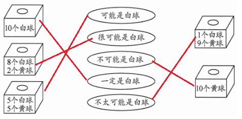 二、从下面5个盒子里分别任意摸一个球,可能出现什么结果?连一连。