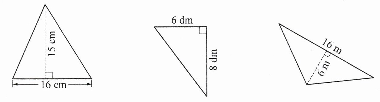 综上,三个三角形面积分别为$\boldsymbol{120cm^{2}}$、$\boldsymbol{24dm^{2}}$、$\boldsymbol{48m^{2}}$。