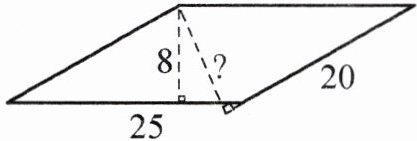 3. 下图是一个平行四边形,相邻两边的长分别是25厘米和20厘米,一条高是8厘米,图中未知的高是多少厘米?
