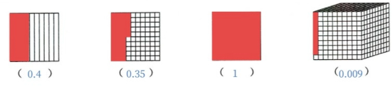 下面每个图形都表示整数“1”。选择合适的图形,分别涂色表示 $1$、$0.009$、$0.35$、$0.4$,并在图下写出相应的小数。