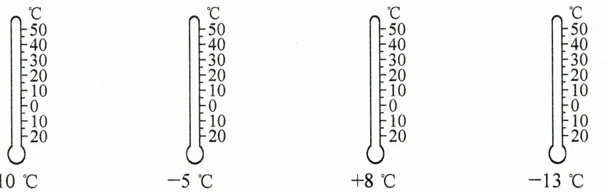 第四个温度计:温度值为$-13° C$,因此在0°C以下找到第13个刻度涂色直至对应高度。