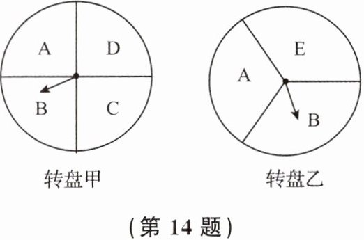 14. (本题10分)某超市在端午节期间开展优惠活动,凡购物者可以通过转动转盘的方式享受折扣优惠,本次活动共有两种方式,方式一:转动转盘甲,指针指向A区域时,所购买物品享受九折优惠,指针指向其他区域无优惠;方式二:同时转动转盘甲和转盘乙,若两个转盘的指针指向区域的字母相同,所购买物品享受八折优惠,其他情况无优惠. 在每个转盘中,指针指向每个区域的可能性相同(若指针指向分界线,则重新转动转盘).