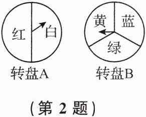 2. 用如图所示的两个可自由转动的转盘做“配紫色”游戏(其中一个转出红色,另一个转出蓝色即可配成紫色). 其中转盘A被等分成两个扇形,转盘B被等分成三个扇形. 如果同时转动两个转盘,那么转盘停止时指针所指的颜色可配成紫色的概率是(