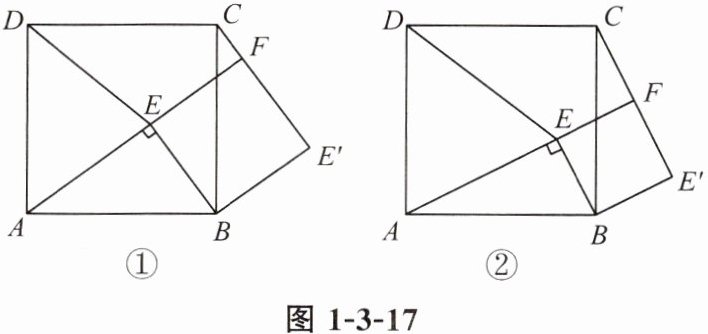 如图1-3-17①,点E为正方形ABCD内一点,∠AEB= 90°,将Rt△ABE绕点B按顺时针方向旋转90°,得到△CBE'(点A的对应点为点C)。延长AE交CE'于点F,连接DE。