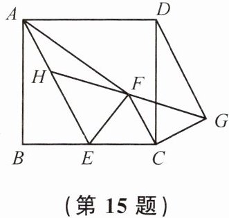 15. 如图,正方形ABCD中,点E是BC的中点,$\triangle ABE与\triangle AFE$关于AE所在直线对称,连接CF,将线段CF绕点C顺时针旋转$90^{\circ}$得到线段CG,连接DG,射线GF交AE于点H. 若$AB = 4$,则线段FH的长为
