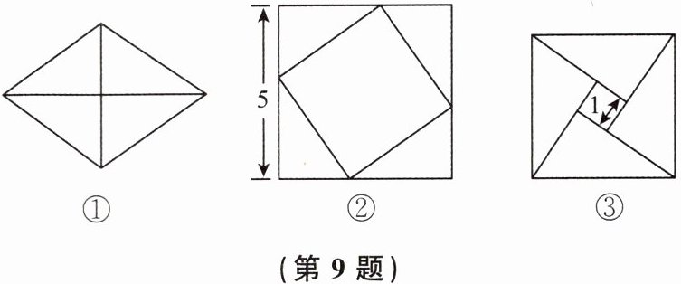9. 把图①中的菱形沿对角线分成四个全等的直角三角形,将这四个直角三角形分别拼成如图②、图③所示的正方形,则图①中菱形的面积为