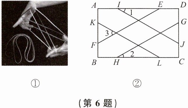 6. 翻花绳是中国民间流传的儿童游戏. 图①是翻花绳的一种图案,可以抽象成图②,在矩形 ABCD 中,若 IJ//KL,EF//GH,∠1 = ∠2 = 30°,则∠3 的度数为