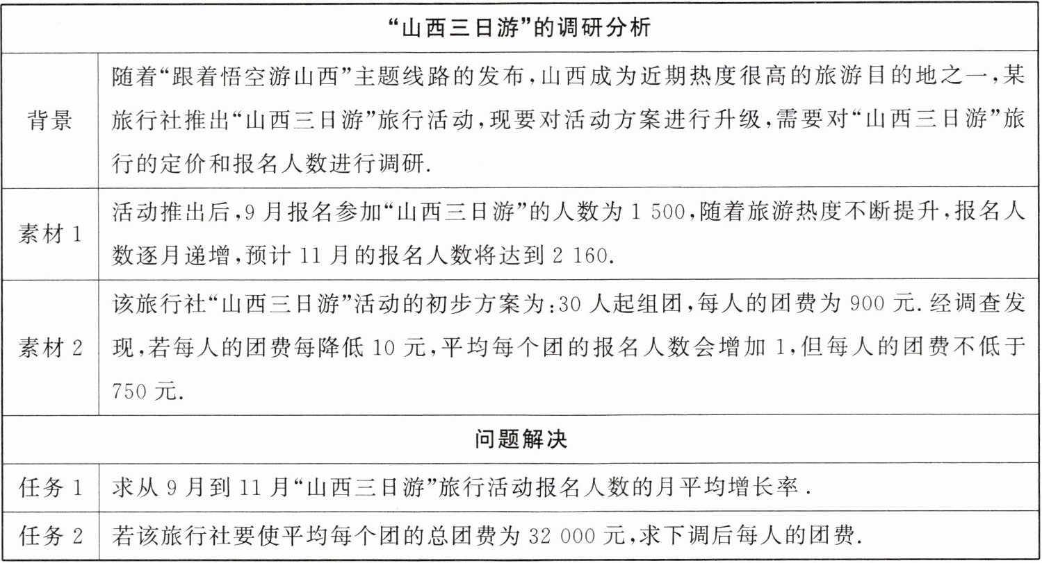 | 任务1 | 求从9月到11月“山西三日游”旅行活动报名人数的月平均增长率. |