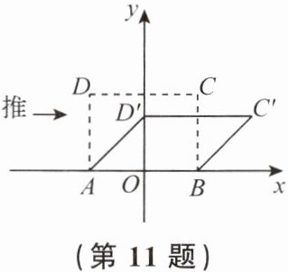11. 如图,在平面直角坐标系中,矩形活动框架 $ABCD$ 的长 $AB = 2$,宽 $AD = \sqrt{2}$,其中边 $AB$ 在 $x$ 轴上,且原点 $O$ 为 $AB$ 的中点. 固定点 $A$,$B$,把这个矩形活动框架沿箭头方向推,使点 $D$ 落在 $y$ 轴的正半轴点 $D'$ 处,则点 $C$ 的对应点 $C'$ 的坐标为