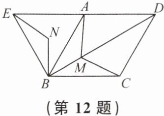 12. 如图,四边形 $ABCD$ 是菱形,$AB = 4$,且 $\angle ABC = \angle ABE = 60^{\circ}$,$M$ 为对角线 $BD$(不含点 $B$)上任意一点,将 $BM$ 绕点 $B$ 逆时针旋转 $60^{\circ}$ 得到 $BN$,连接 $EN$,$AM$,$CM$,则 $AM + BM + CM$ 的最小值为